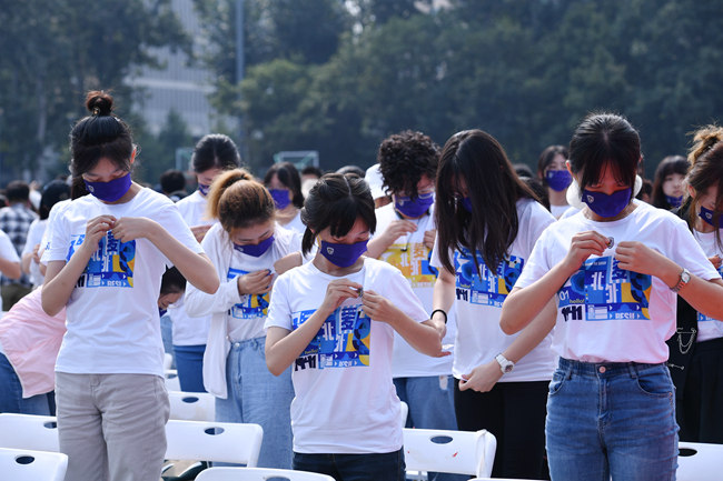 随后的新生拜师献花仪式上,新生代表向教师代表鞠躬并献上鲜花。学生代表带领全体学生集体宣读入学誓词:铭记兼容并蓄、博学笃行的北外校训,志存高远,勤学力行。敬师爱校、诚以待人。强健体魄、阳光向上。珍惜韶华,奋发有为。胸怀天下,敢于争先。不畏艰难,勇担使命。服务人民,奉献祖国。