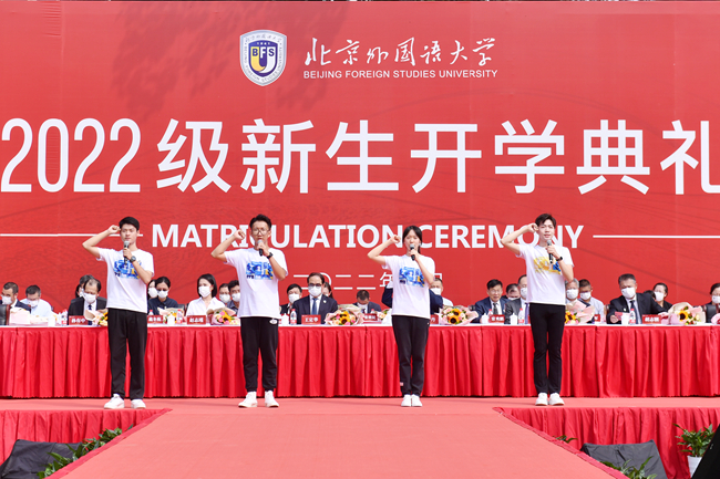 本科新生代表日语学院日语专业李子乐号召同学们以全新的面貌开启人生新旅程,希望和同学们携手奋进,做有理想、有本领、有担当的北外人。英语学院英语笔译专业政治文献翻译方向首届新生、研究生新生代表李泽晖同学倡导同学们要“游于语言,依于北外,据于中国,志于世界”,将红色基因不断传承,在伟大事业中绽放光彩。留学生代表、中国语言文学学院博士生、来自白俄罗斯的格里沙耶娃(Hryshayeva Katsiaryna)希望努力践行“兼容并蓄、博学笃行”的校训精神,成为有真才实学的北外人,为增进中白友谊贡献自己的力量,希望和同学们一起为人类命运共同体建设做出更多贡献。